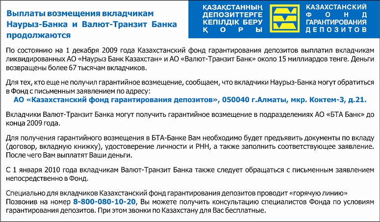Выплата гарантийного возмещения вкладчикам Валют-Транзит Банка и Наурыз-Банка продолжается