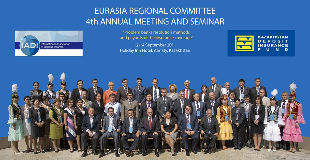 12-13 сентября 2011 года в Алматы прошло четвертое годовое собрание Евразийского регионального комитета Международной Ассоциации Систем Страхования Депозитов (IADI), а также семинар «Методы урегулирования финансовой несостоятельности проблемных банков и выплаты гарантийного возмещения»