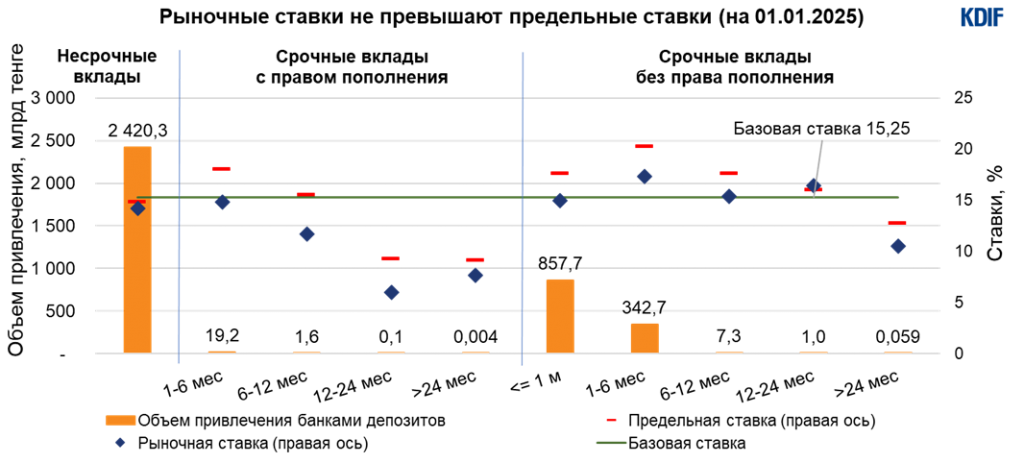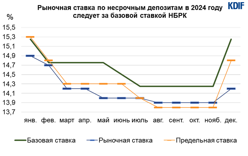 Таким образом, ограничение спектра применения «потолка ставок» и дифференциация предельных ставок в зависимости от вида и срока вклада позволили достичь нескольких целей. Во-первых, в 2024 году рыночные ставки в сегменте несрочных депозитов двигались вслед за динамикой базовой ставки НБРК. Механизм позволял с одной стороны учитывать рыночные настроения участников банковского сектора, а с другой – оперативно реагировать на проводимую НБРК денежно-кредитную политику. И именно гибкий и развитый сегмент несрочных депозитов способствовал своевременной передаче сигналов трансмиссионного механизма на финансовый рынок.