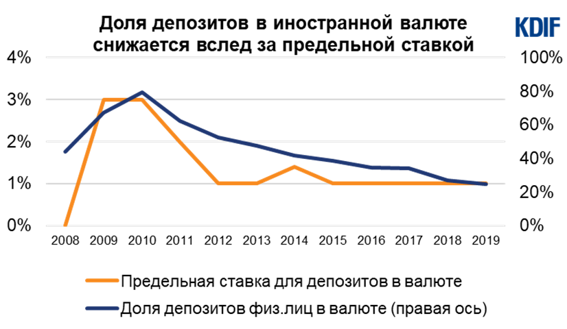 С 2008 года КФГД начал устанавливать две предельные ставки, так называемый потолок: по депозитам физических лиц в тенге и в иностранной валюте. За превышение потолка банки уплачивают повышенный взнос. Данный механизм был также использован в качестве инструмента по дедолларизации экономики и повышению привлекательности национальной валюты.
